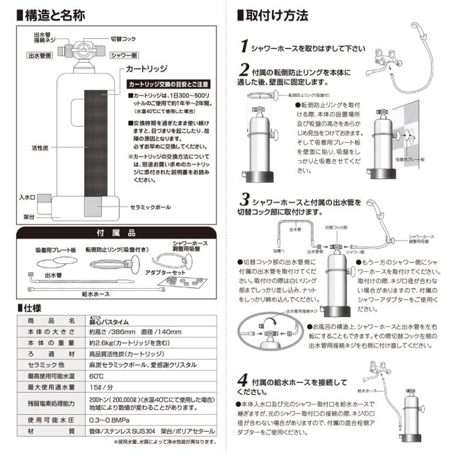 残留塩素処理能力は 200トン (200,000ℓ)3~4人家族で、約2年間ご使用できます。
